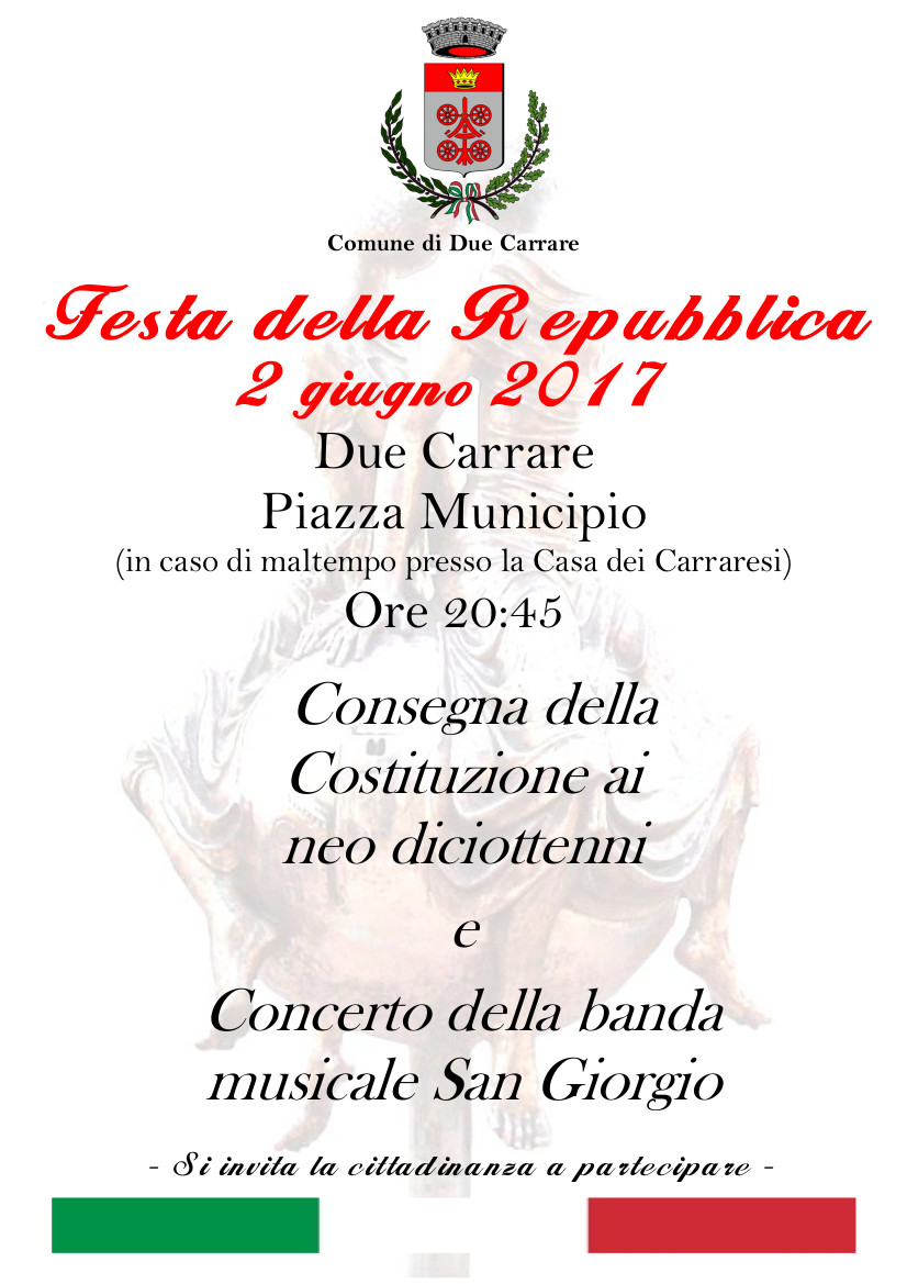 Anche quest'anno, festeggeremo il Due giugno con la distribuzione della Costituzione italiana ai diciottenni e con un concerto della Banda! Aspettiamo tutta la cittadinanza nella piazza del Municipio alle 20.45; in caso di maltempo, la serata si svolgerà nella Casa dei Carraresi.