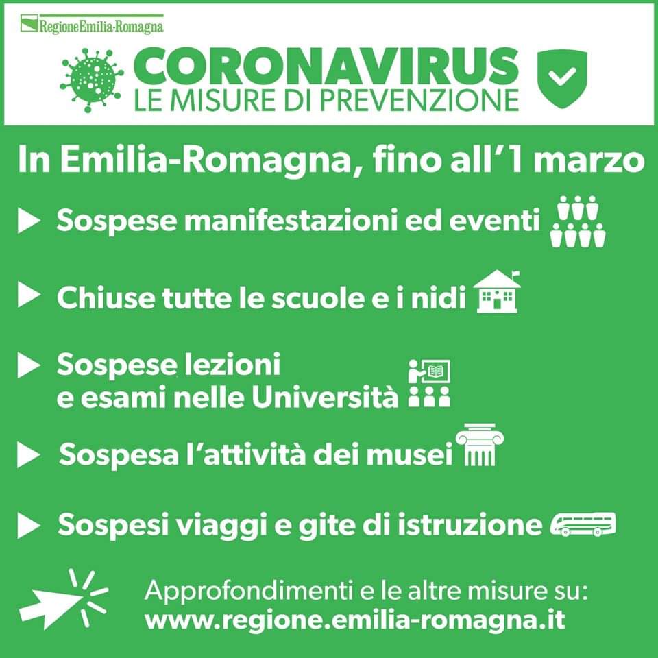 Salute. Aggiornamento Coronavirus: da domani, e fino al 1^ marzo, in Emilia-Romagna chiusura di tutte le scuole di ogni ordine e grado, asili nido, Università, musei, manifestazioni ed eventi, procedure concorsuali. Ordinanza del presidente Bonaccini e del ministro Speranza