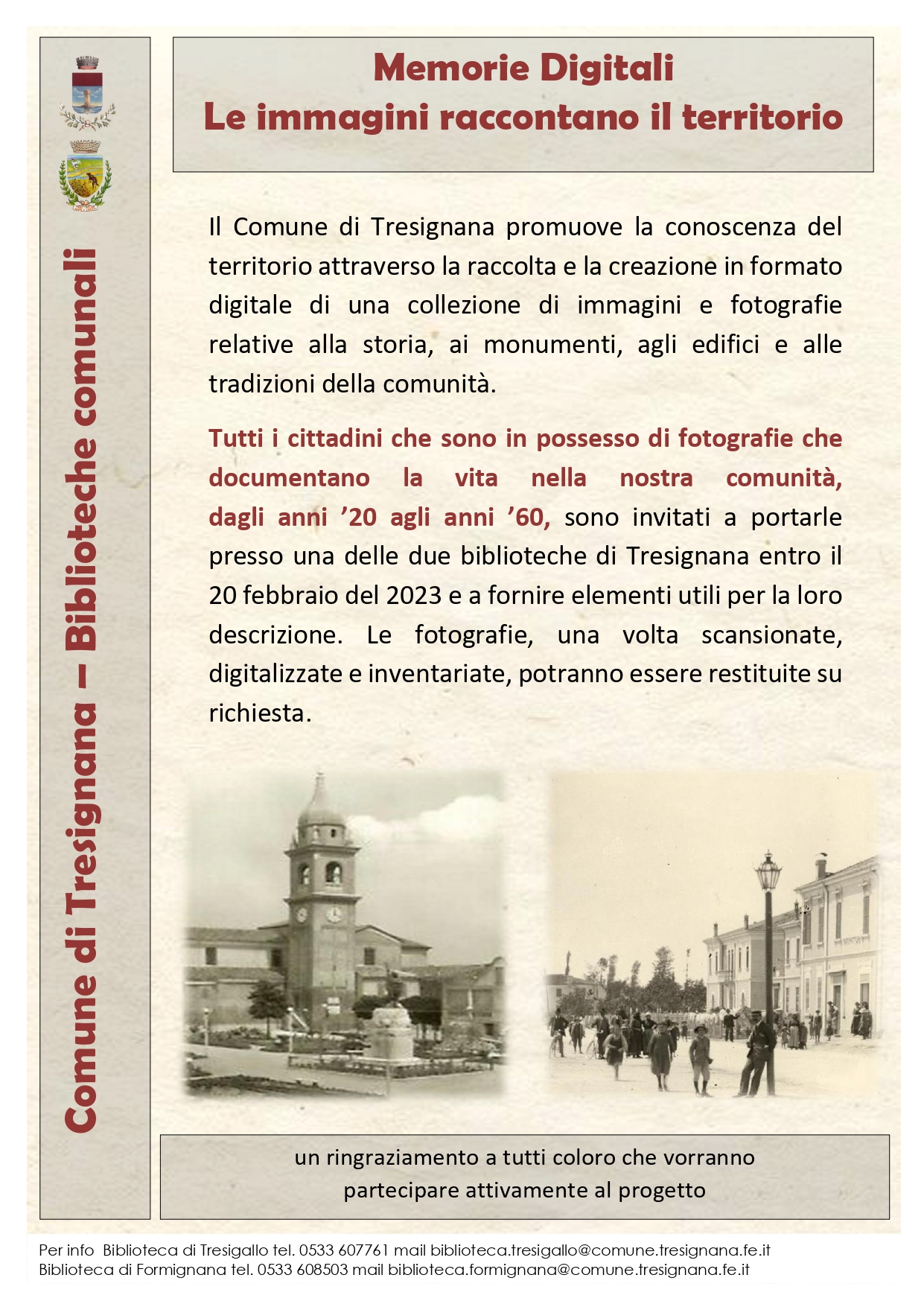 L’Amministrazione Comunale di Tresignana, ha messo in campo il progetto: Memorie Digitali - Le immagini raccontano il territorio. Si tratta di un’iniziativa volta a promuovere il nostro Comune attraverso la creazione di un archivio digitale di immagini e fotografie relative alla storia, ai monumenti, agli edifici e alle tradizioni della comunità. Invitiamo quindi tutti i cittadini che sono in possesso di fotografie che documentano la vita nel nostro territorio, dagli anni ’20 agli anni ’60, a portarle presso una delle due biblioteche di Tresignana entro il 20 febbraio 2023. Una volta scansionate e catalogate le fotografie potranno essere restituite su richiesta.